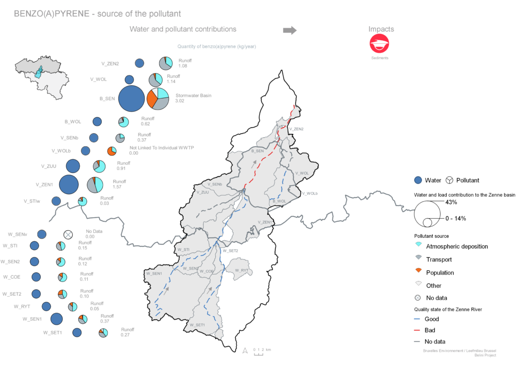 Elke lidstaat moet om de 6 jaar een Druk en Impact Analyse opmaken. Dit beschrijft de druk van de mens op ons watersysteem en de impact die het ecosysteem daarvan ondervindt. Deze analyse is cruciaal bij het opstellen van het maatregelenprogramma om de ecologische waterkwaliteit in alle waterlichamen opnieuw op peil te krijgen. In België voert elke regio (Vlaanderen, Brussel en Wallonië) dergelijke druk en impact analyse uit. Allen gebruiken hiervoor de WEISS (Water Emission Inventory Support System) tool. Vanwege verschillende benaderingen (bron-proces gerichte kijk), vrachtinschattingen, probleempolluenten (context),… in de verschillende regio’s kan men echter tot verschillende inzichten komen. Daarom kan het waardevol zijn dit op een gewest-overschrijdende manier te bekijken. Zo komen we meer te weten over de druk en impact op ons watersysteem als geheel en kunnen we álle nodige maatregelen nodig detecteren en nemen. Deze oefening werd gemaakt voor de Zenne, een rivier die de drie regio’s doorkruist, en in elke regio zijn specifieke uitdagingen kent.